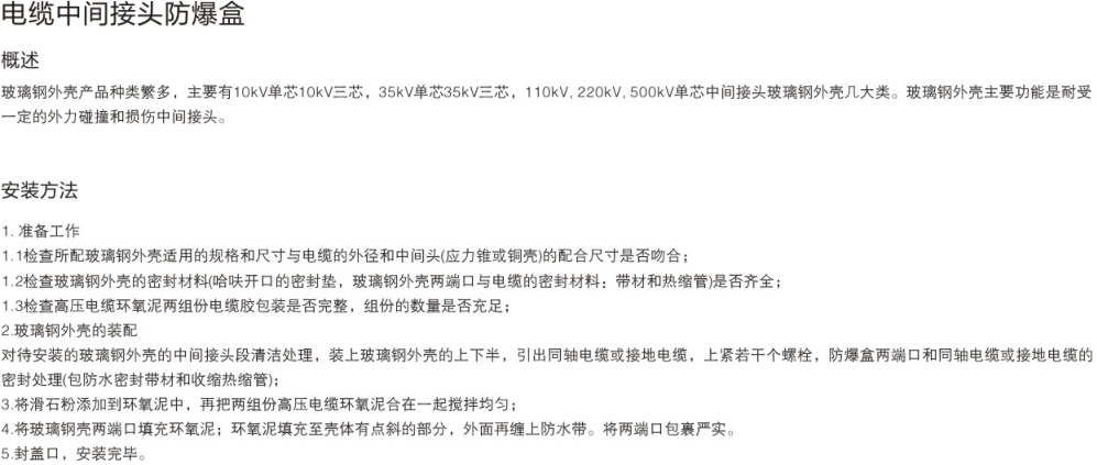 電纜防爆盒主要作用是保護電纜不受擠壓,另一個(gè)作用是絕緣。電纜防爆箱采用玻璃鋼制成,機械強度高,耐壓性好。通常,當電源線(xiàn)過(guò)長(cháng)時(shí),電纜防爆盒需要連接熱縮電纜附件熱縮電纜中間接頭和冷縮電纜附件冷縮電纜中間接頭。讓電能到達耗電的地方。